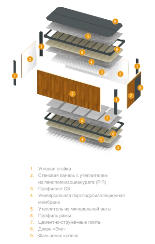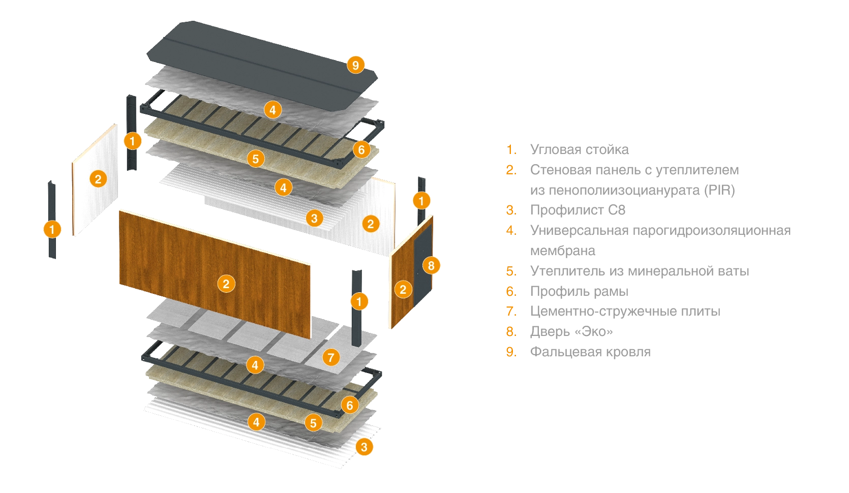 Отсутствие монтажных сварочных работ, использование качественной порошковой окраски стали и долговечного PIRутеплителя увеличивают срок службы хозяйственного блока при бережной эксплуатации до 50 лет.
